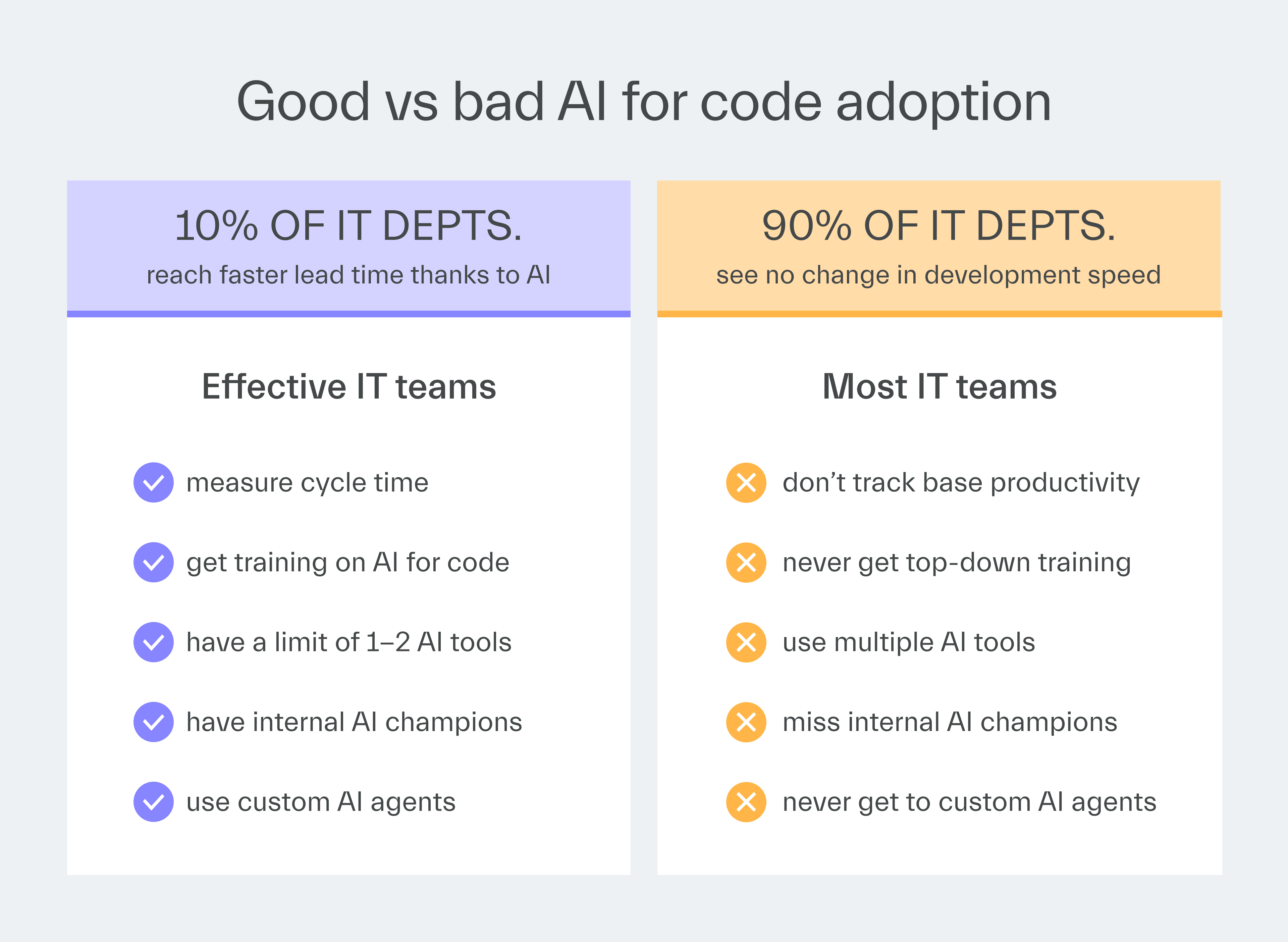 IT managers introduce best practices for given AI-for-code tools through EMs or Team Leads who measure success in cycle time.