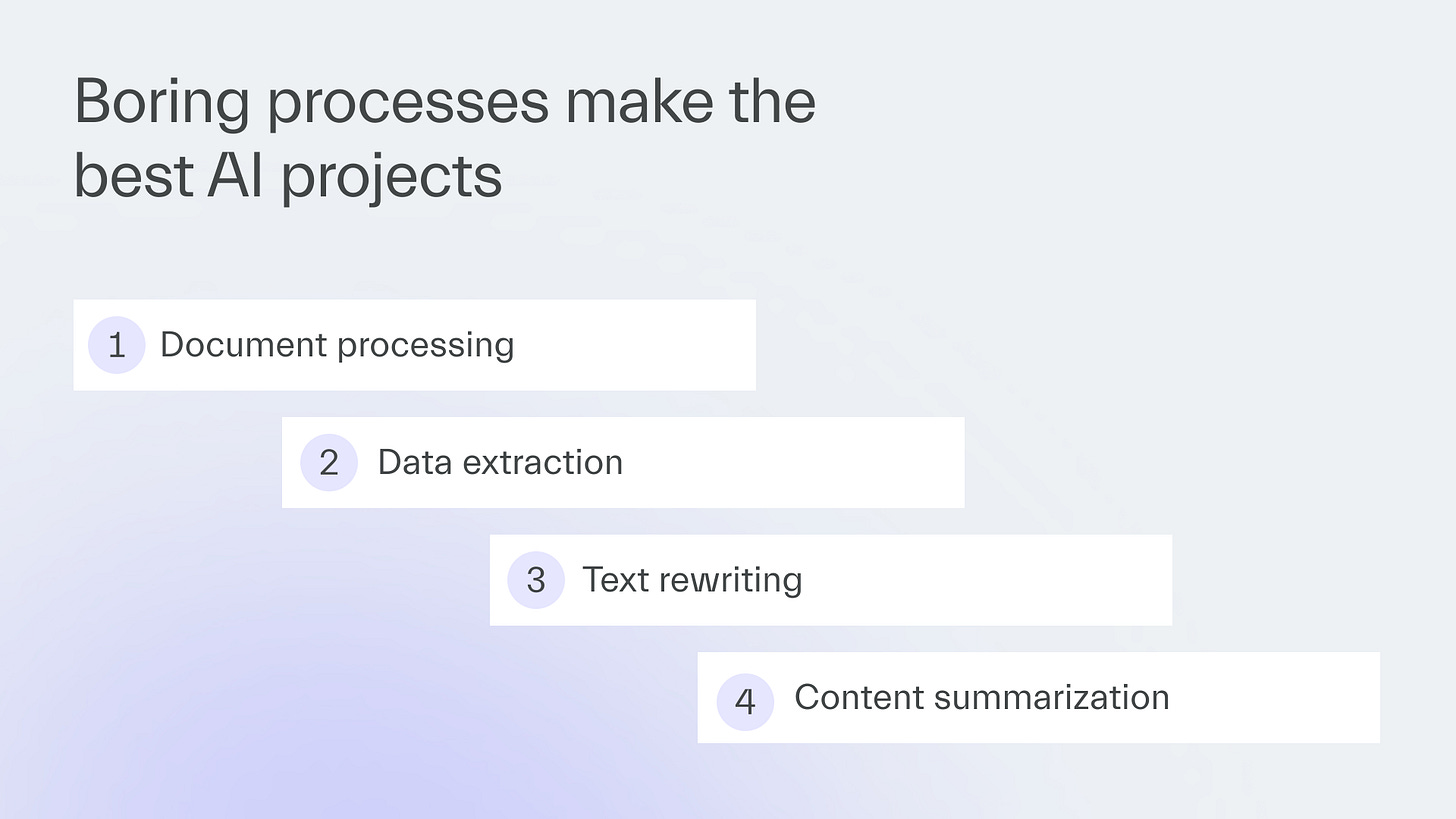 Try automating time-consuming tasks, such as document processing, data extraction, or content summarization.