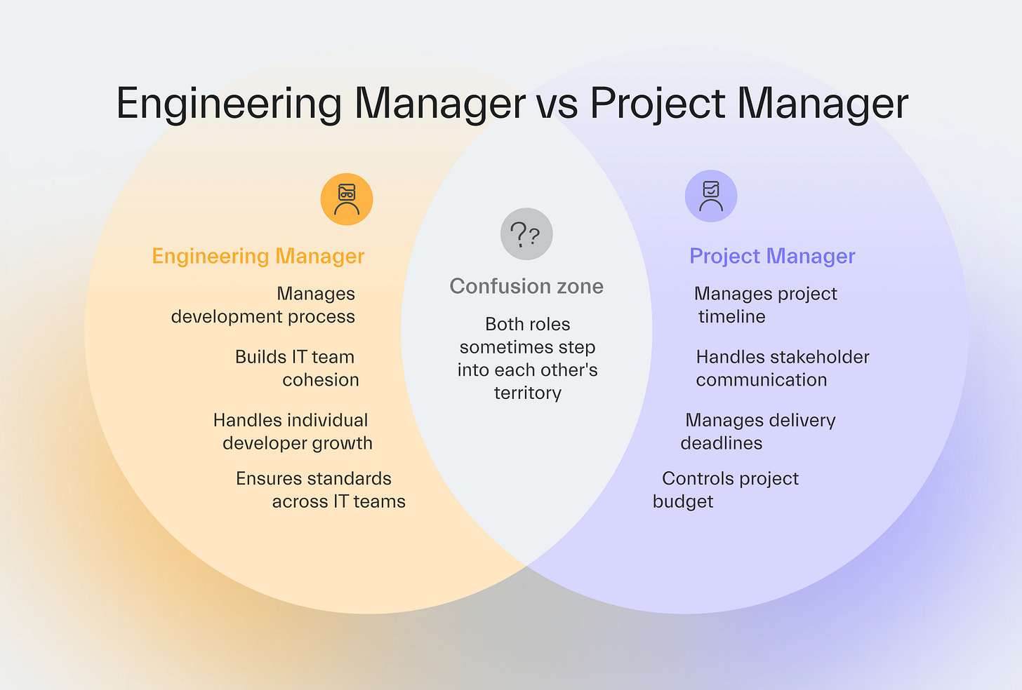 Some organizations struggle to separate EM and PM responsibilities,