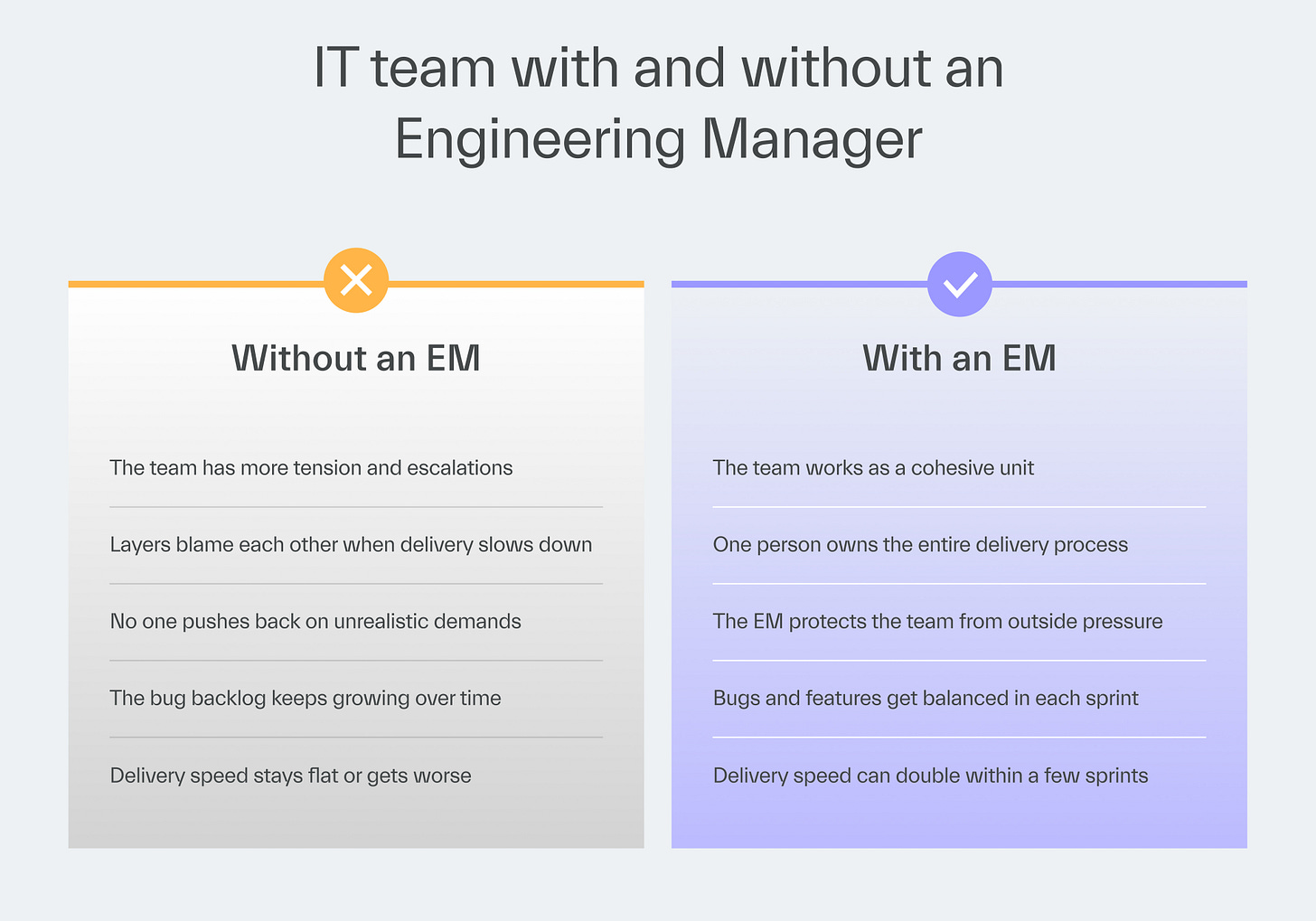 If a CTO finds themselves unable to improve IT’s output directly, an EM can take over this responsibility.